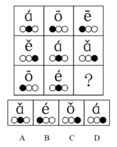 第一行中字母聲調(diào)為二聲,黑球在中間,字母聲調(diào)為一聲,黑球在最左邊,即聲調(diào)與黑點(diǎn)的位置是相對應(yīng)的。第二行規(guī)律得到驗(yàn)證,第三行運(yùn)用該規(guī)律,只有C項(xiàng)符合。