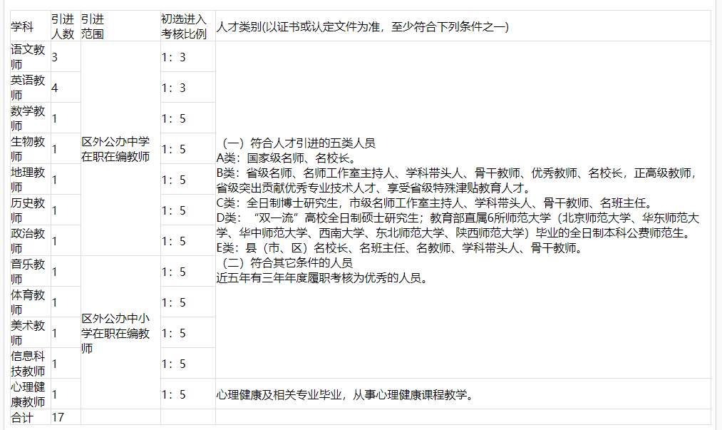 (五)具備初中及以上教師資格證;近五年年度考核在合格及以上等次;所學(xué)專業(yè)和任教學(xué)科與報(bào)考崗位相近或相符;年齡在40周歲以下(1983年7月14日及以后出生),A、B類人才中特別優(yōu)秀的年齡可適當(dāng)放寬。