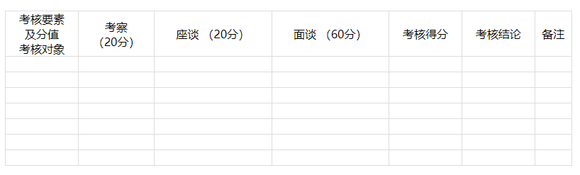 備注:1.考察重點考察其在政治思想、道德品質(zhì)、能力素養(yǎng)、遵紀守法、廉潔自律、崗位匹配等方面的情況以及學習工作的表現(xiàn);2.座談重點了解其是否具有專業(yè)技術、科技素質(zhì)和工作能力;3.面談重點了解其綜合分析能力、應急應變能力、組織協(xié)調(diào)能力和語言理解與表達能力等。