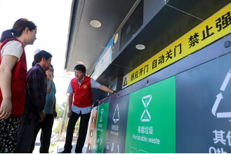 在安徽省合肥市長(zhǎng)豐縣莊墓鎮(zhèn)棗林社區(qū),志愿者指導(dǎo)居民使用智能垃圾分類(lèi)回收設(shè)備(2023年9月1日攝)。新華社記者曹力 攝