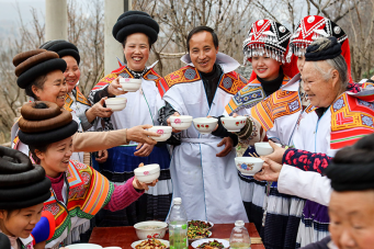 在位于烏蒙山區(qū)腹地的貴州省畢節(jié)市納雍縣,苗族村民馬雍(右五)與妻子黃國(guó)琴(左五)在年夜飯上與大家干杯(2021年2月11日攝)。新華社記者歐東衢 攝