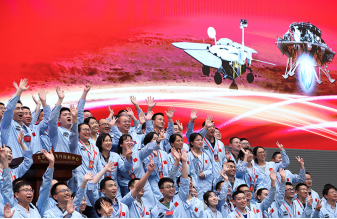 北京航天飛行控制中心青年科技人才群體慶祝我國(guó)首次火星探測(cè)任務(wù)著陸火星成功(2021年5月15日攝)。新華社記者金立旺 攝