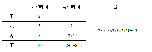 在排隊取水問題中,幾個人的取水時間是固定不變的,只需讓其等待時間最短即可。要使等待時間最短,就讓取水時間短的人先取水,從而確定幾個人的取水順序,再去計算時間。