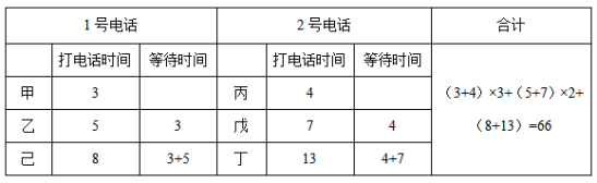 2.公用電話亭中有兩部電話,有甲、乙、丙、丁、戊、己6個人排隊打電話,打完即走,他們撥打電話時間分別為3分鐘、5分鐘、4分鐘、13分鐘、7分鐘、8分鐘,則大家在此公用電話亭逗留的總時間最少為多少分鐘( )?