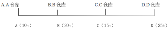 【答案】C【解析】當支點位于AB中間時,左邊的重量(10t)<右邊的重量(60t),因此支點往右移動,當支點位于BC中間時,左邊的重量(30t)<右邊的重量(40t),因此支點往右移動,當支點位于CD中間時,左邊的重量(45t)>右邊的重量(25t),因此支點往左移動,故為使得運輸費用最少,應該把貨物集中到C倉庫。故本題選C。