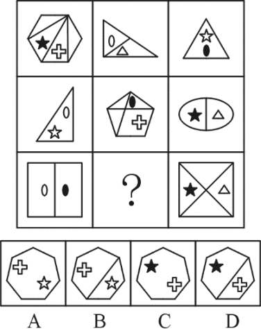 【答案】A【解析】每一行圖形內(nèi)部有6個(gè)小圖形,分別是黑星星,白星星,黑圈,白圈,白三角,十字。因此,第三行問(wèn)號(hào)處內(nèi)部圖形應(yīng)該是白星星和十字,排除C,D。每一行封閉空間的數(shù)量分別是1,2,4,所以第三行問(wèn)號(hào)處是一個(gè)封閉空間。因此本題選A。