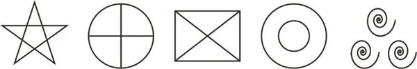 出現(xiàn)典型數(shù)筆畫(huà)的圖形考慮數(shù)筆畫(huà)。當(dāng)題干中出現(xiàn)五角星(四角星、六角星)、月亮、切圓、外接圓、“日”字的變形圖,如圓柱,一般會(huì)考查一筆畫(huà);另外,若出現(xiàn)“田”字的變形圖,字母“A”的變形圖則會(huì)考查兩筆畫(huà)。