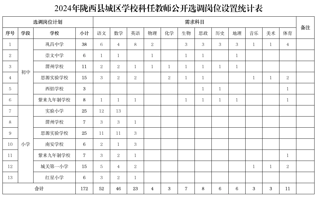 根據(jù)2024年部分城區(qū)學(xué)校教師需求,公開選調(diào)科任教師172名,其中初中教師81名、小學(xué)教師91名。選調(diào)范圍為除鞏昌鎮(zhèn)、文峰鎮(zhèn)所在地以外的縣直學(xué)校和除鞏昌學(xué)區(qū)、文峰學(xué)區(qū)轄區(qū)以外的農(nóng)村中小學(xué)幼兒園在職公辦教師。具體崗位設(shè)置見下表。