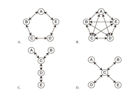 【答案】【解析】正確答案為D。第一步:找出定義要點(diǎn)。輪式網(wǎng)絡(luò):“一個(gè)下級(jí)同時(shí)與多個(gè)主管聯(lián)系”、“主管之間沒有溝通的情形”;Y式網(wǎng)絡(luò):“第二級(jí)有兩個(gè)上級(jí)與之聯(lián)系”、“第三級(jí)與一個(gè)或更多下級(jí)發(fā)生聯(lián)系”;環(huán)式網(wǎng)絡(luò):“每個(gè)成員僅與相鄰者聯(lián)系”、“不能與更遠(yuǎn)的成員進(jìn)行溝通”;全通道式網(wǎng)絡(luò):“所有成員間充分進(jìn)行溝通”、“所有成員的地位是平等的,無(wú)核心人物”。第二步:逐一分析選項(xiàng)。A項(xiàng):每個(gè)字符只與其相鄰的兩個(gè)字符間有聯(lián)系,與其他不相鄰的沒有聯(lián)系,符合“每個(gè)成員僅與相鄰者聯(lián)系”、“不能與更遠(yuǎn)的成員進(jìn)行溝通”,符合“環(huán)式網(wǎng)絡(luò)”定義,不符合“輪式網(wǎng)絡(luò)”定義,排除;B項(xiàng):每個(gè)字符與其他所有字符都有聯(lián)系,而且無(wú)核心字符,符合“所有成員間充分進(jìn)行溝通”、“所有成員的地位是平等的,無(wú)核心人物”,符合“全通道式網(wǎng)絡(luò)”定義,不符合“輪式網(wǎng)絡(luò)”定義,排除;C項(xiàng):字符C分別與兩個(gè)上級(jí)字符A、B以及一個(gè)下級(jí)字符D有聯(lián)系,符合“第二級(jí)有兩個(gè)上級(jí)與之聯(lián)系”、“第三級(jí)與一個(gè)或更多下級(jí)發(fā)生聯(lián)系”,符合“Y式網(wǎng)絡(luò)”定義,不符合“輪式網(wǎng)絡(luò)”定義,排除;D項(xiàng):字符C作為下屬時(shí),分別與多個(gè)主管字符A、B、C、D有聯(lián)系,但是主管字符A、B、C、D之間沒有聯(lián)系,符合“一個(gè)下級(jí)同時(shí)與多個(gè)主管聯(lián)系”、“主管之間沒有溝通的情形”,符合“輪式網(wǎng)絡(luò)”定義,當(dāng)選。