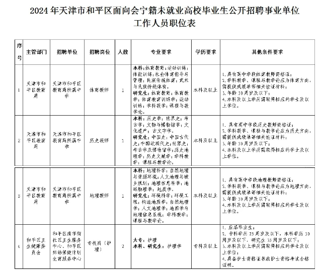 ?。ㄋ模┢渌麠l件詳見《2024年天津市和平區(qū)面向會(huì)寧籍未就業(yè)高校畢業(yè)生公開招聘事業(yè)單位工作人員職位表》。
