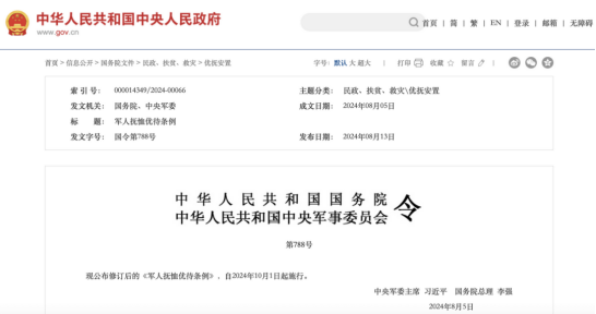 中國(guó)政府網(wǎng)公布修訂后的《軍人撫恤優(yōu)待條例》,自2024年10月1日起施行。