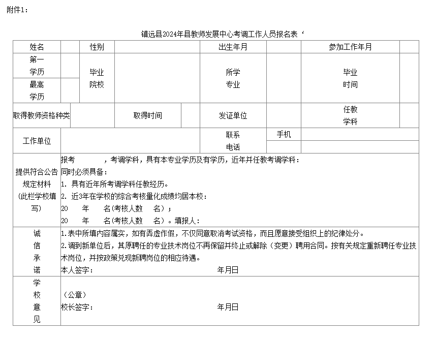 附件:1.鎮(zhèn)遠縣2024年縣教師發(fā)展中心考調工作人員報名表