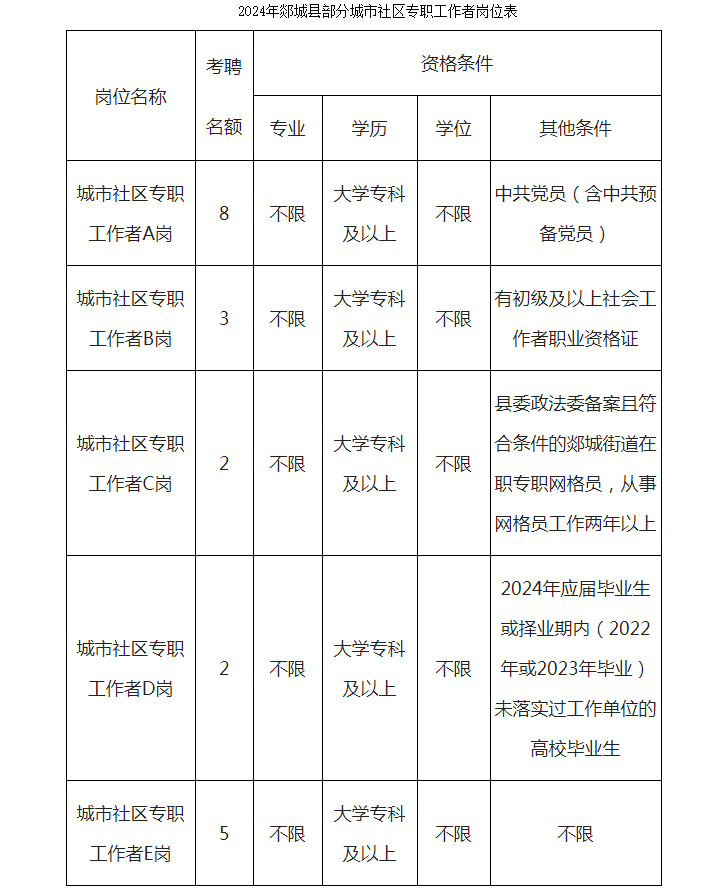 全縣計(jì)劃考聘20人,工作地點(diǎn)為郯城街道各城市社區(qū)。招考崗位共設(shè)A、B、C、D、E五類崗位。