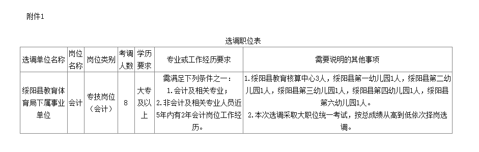 共選調(diào)會計工作人員8名(事業(yè)專業(yè)技術(shù)人員),其中綏陽縣教育核算中心3名、綏陽縣第一幼兒園1名、綏陽縣第二幼兒園1名、綏陽縣第三幼兒園1名、綏陽縣第四幼兒園1名、綏陽縣第六幼兒園1名。選調(diào)設(shè)置大職位,按總成績從高到低依次擇崗選調(diào)。具體詳見附件1。