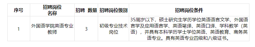 吉林農(nóng)業(yè)大學(xué)根據(jù)工作需要,現(xiàn)面向社會(huì)招聘外語教師3名,具體事宜如下。