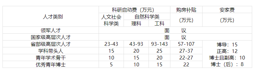 ?。?)學(xué)校為全職在我校工作的引進(jìn)人才提供博士學(xué)位津貼、安家費(fèi)、購(gòu)房補(bǔ)貼和科研啟動(dòng)費(fèi)等,安家費(fèi)、購(gòu)房補(bǔ)貼(分5年支付)和科研啟動(dòng)費(fèi)標(biāo)準(zhǔn)見(jiàn)《全職引進(jìn)人才享受優(yōu)惠待遇參照表》,博士學(xué)位津貼按每月1000元發(fā)放。