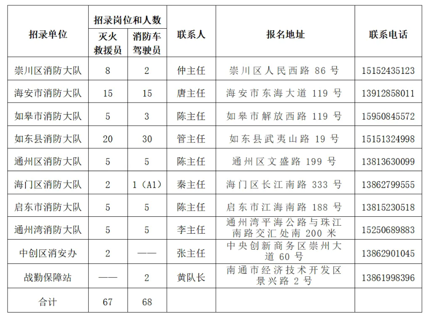 為滿足社會發(fā)展對消防救援力量的需求,根據南通市各縣(市、區(qū))滅火救援工作實際需要,現(xiàn)面向社會公開招錄政府專職消防隊員135名。具體公告如下: