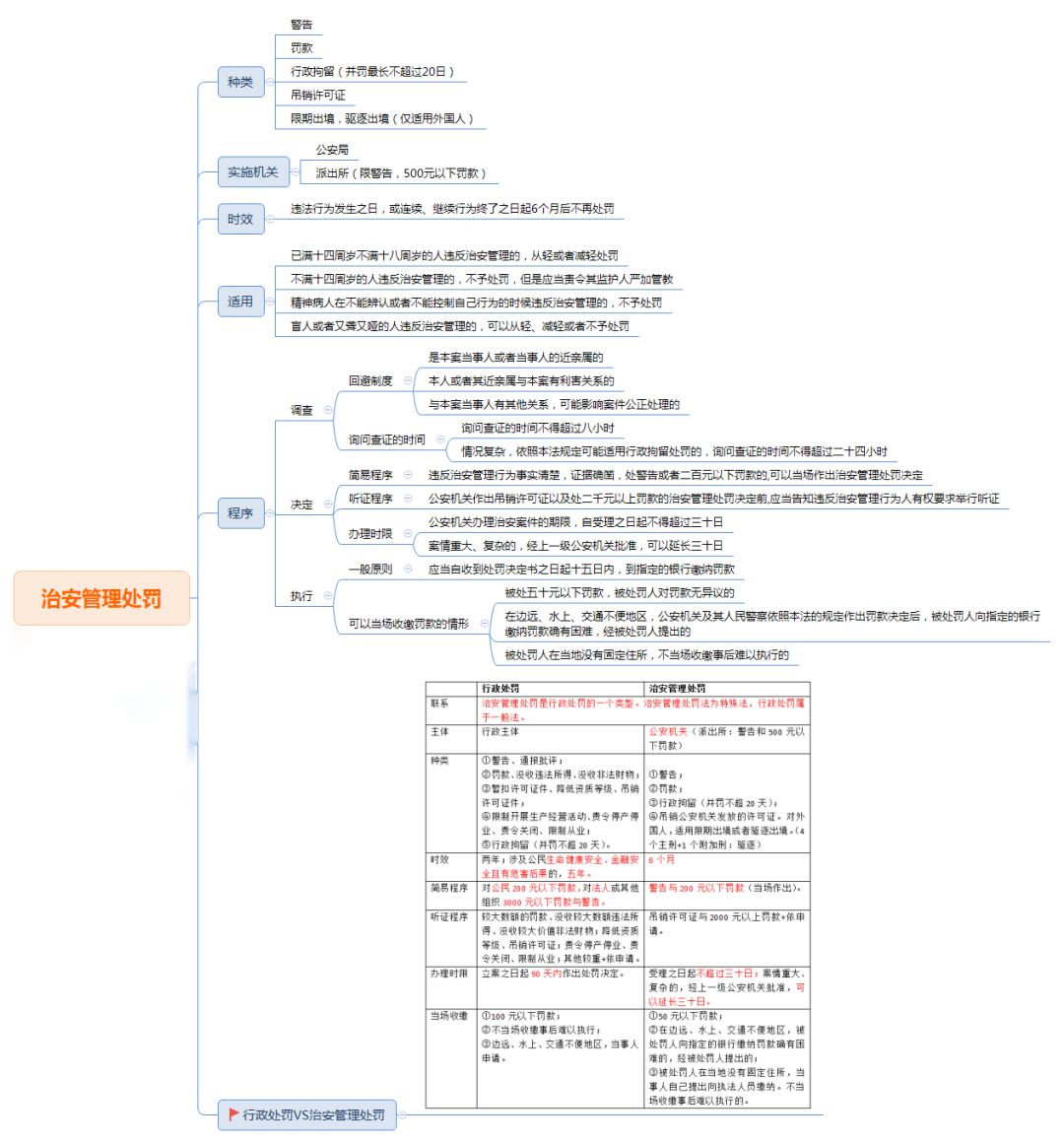 種類 | ①警告、通報(bào)批評(píng); ②罰款、沒收違法所得、沒收非法財(cái)物; ③暫扣許可證件、降低資質(zhì)等級(jí)、吊銷許可證件; ④限制開展生產(chǎn)經(jīng)營(yíng)活動(dòng)、責(zé)令停產(chǎn)停 業(yè)、責(zé)令關(guān)閉、限制從業(yè); ⑤行政拘留(并罰不超20天)。 | ①警告 ②罰款; ③行政拘留(并罰不超20天), ④吊銷公安機(jī)關(guān)發(fā)放的許可證。對(duì)外國(guó)人,適用限期出境或者驅(qū)逐出境。(4個(gè)主刑+1個(gè)附加刑:驅(qū)逐) |