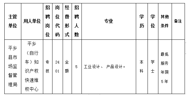為滿足縣市場(chǎng)監(jiān)管局所屬平鄉(xiāng)(自行車)知識(shí)產(chǎn)權(quán)快速維權(quán)中心用人需要,根據(jù)《河北省事業(yè)單位公開招聘工作人員暫行辦法》,結(jié)合2024年用人單位工作人員招聘計(jì)劃和崗位空缺情況,平鄉(xiāng)縣人力資源和社會(huì)保障局?jǐn)M面向社會(huì)公開招聘全額財(cái)政事業(yè)編制人員5名?,F(xiàn)公告如下: