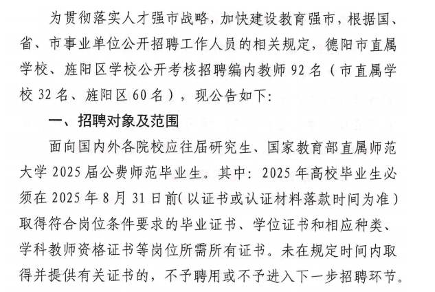 四川德陽市直屬及旌陽區(qū)學(xué)校面向研究生、2025屆部屬公費(fèi)師范畢業(yè)生招聘教師92人公告