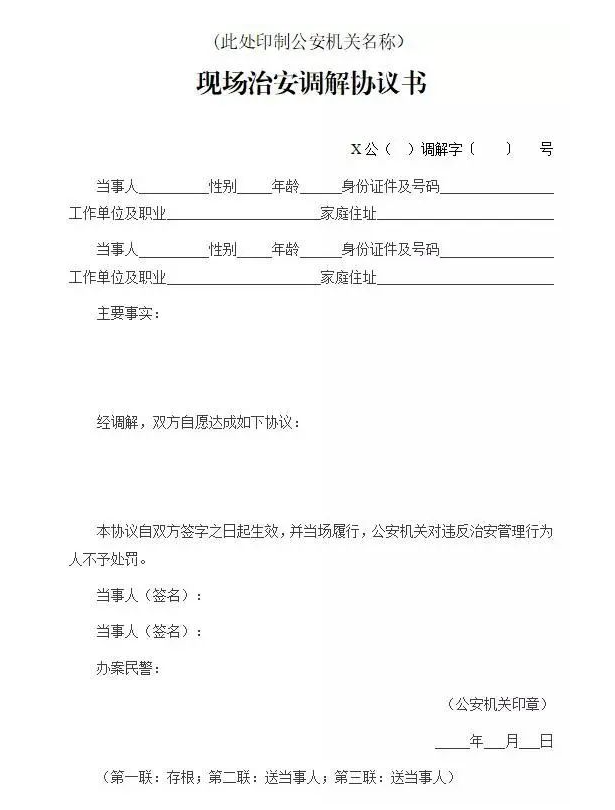 現(xiàn)場調(diào)解達(dá)成協(xié)議的,應(yīng)當(dāng)制作《現(xiàn)場治安調(diào)解協(xié)議書》一式三聯(lián)(式樣附后),由雙方當(dāng)事人簽名。