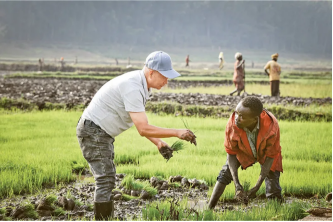 近年來,中非農(nóng)業(yè)合作不斷深化,中國農(nóng)作物品種和農(nóng)科技術(shù)正跨越山海,在非洲大陸生根發(fā)芽,把沃土變良田。圖為2024年8月14日,在盧旺達(dá)南方省胡耶區(qū)的中國援盧旺達(dá)農(nóng)業(yè)技術(shù)示范中心,中國水稻專家在稻田里指導(dǎo)當(dāng)?shù)氐巨r(nóng)進(jìn)行秧苗移栽。新華社記者 韓旭/攝