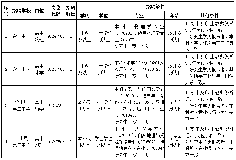計(jì)劃招聘高中教師4名,具體崗位和資格條件等詳見(jiàn)《安徽省馬鞍山市含山縣省示范高中 2025年度校園招聘崗位計(jì)劃表》(附件1)。