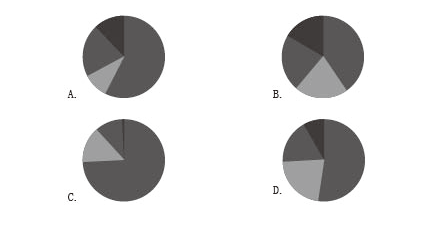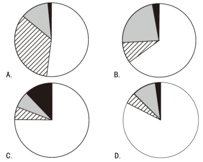 問:以下餅圖中,最能準確反映2022年S市租賃和商務服務業(yè)(白色)、科學研究和技術服務業(yè)(斜線)、信息傳輸軟件和信息技術服務業(yè)(黑色)以及其他所有行業(yè)(灰色)實際使用外資金額占同期S市實際使用外資金額的比重關系的是( )。