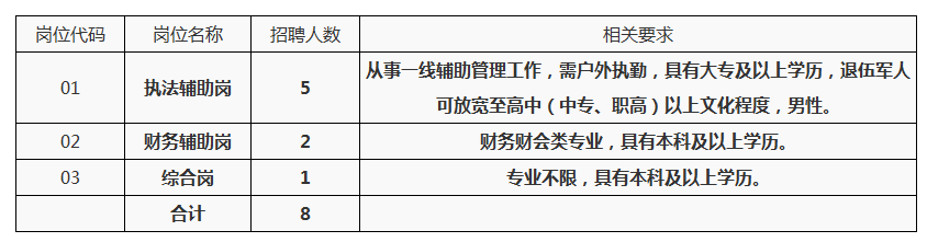 3.熱愛城市管理工作,熱心為群眾服務,辦事公道,有一定的應變協(xié)調、危機處理能力,具有較強的工作責任心和組織紀律性,無違法犯罪記錄,無失信記錄,服從組織安排;