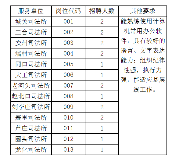為進(jìn)一步夯實基層司法行政工作力量,著力提升司法所服務(wù)基層治理現(xiàn)代化能力和水平,切實做好我縣司法協(xié)理員試點(diǎn)工作,經(jīng)縣委、縣政府批準(zhǔn),決定面向社會公開招聘司法協(xié)理員20名,現(xiàn)將有關(guān)事項公告如下: