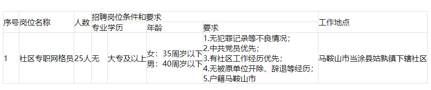 因工作需要,當(dāng)涂縣姑孰鎮(zhèn)人民政府委托馬鞍山市華夏基石人力資源管理有限公司面向社會公開招聘社區(qū)專職網(wǎng)格員,現(xiàn)將招聘工作有關(guān)事項(xiàng)公告如下: