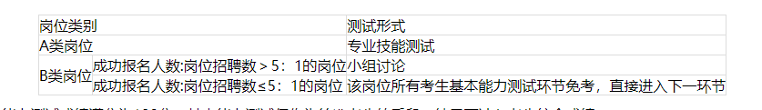 (4)基本能力測試主要采取專業(yè)技能測試、小組討論等形式,對考生進行考察。各崗位具體考核形式見下表。