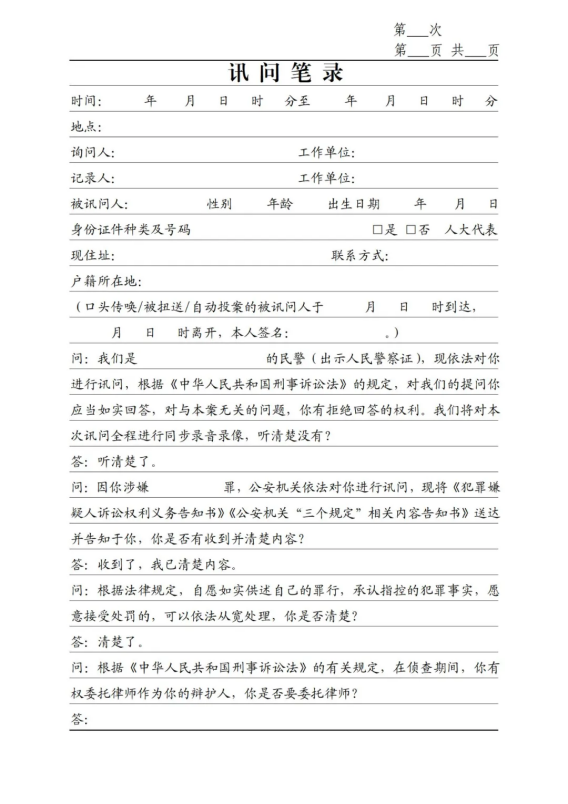 【同錄告知】鑒于部分地區(qū)要求刑事訊問(wèn)一律同錄,故在首問(wèn)明確告知“本次訊問(wèn)全程進(jìn)行同步錄音錄像”,如無(wú)此類要求,則僅在需要進(jìn)行同錄的案件中注明告知該事項(xiàng)即可。