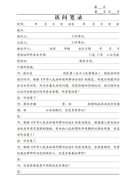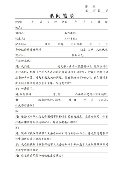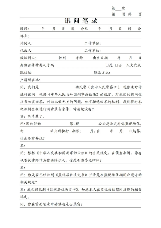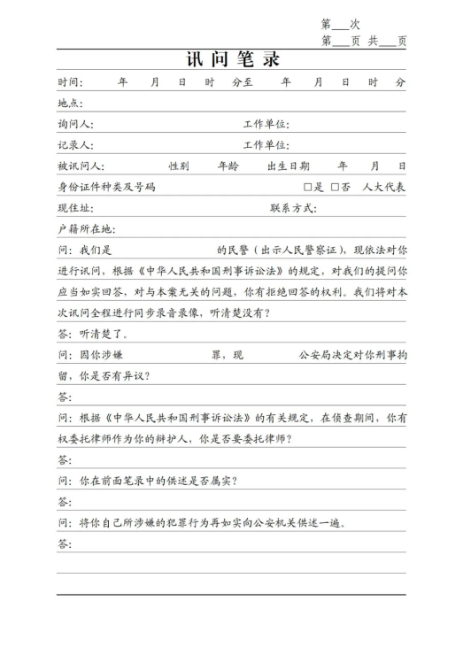 《訊問(wèn)筆錄》(第一次、刑拘、逮捕、取保、監(jiān)居)模板