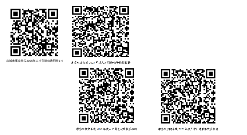 應(yīng)聘人員請于2024年11月11日(周一)9:00至12月10日(周二)16:00期間,結(jié)合自己所學(xué)專業(yè)和報考意向崗位,報考綜合類崗位的掃碼登錄“孝感市綜合類2025年度人才引進秋季校園招聘”報名系統(tǒng)(https://ks.jobhb.com/wsbm/sys-list-hb?fcode=2025xgzhlgw)、報考教育系統(tǒng)崗位的掃碼登錄“孝感市教育系統(tǒng)2025年度人才引進秋季校園招聘”報名系統(tǒng)(https://ks.jobhb.com/wsbm/sys-list-hb?fcode=2025xgwj)、報考衛(wèi)健系統(tǒng)崗位的掃碼登錄“孝感市衛(wèi)健系統(tǒng)2025年度人才引進秋季校園招聘”報名系統(tǒng)(https://ks.jobhb.com/wsbm/sys-list-hb?fcode=2025xgjy),進行網(wǎng)上注冊,設(shè)置個人密碼,提交報名申請。每名應(yīng)聘人員在孝感市范圍內(nèi)限報一個崗位。