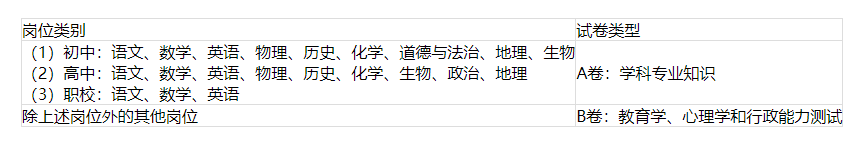 筆試按測(cè)試內(nèi)容分為A、B兩種試卷類型。A卷測(cè)試內(nèi)容為學(xué)科專業(yè)知識(shí),B卷測(cè)試內(nèi)容為教育學(xué)、心理學(xué)和行政能力測(cè)試。具體崗位測(cè)試內(nèi)容見下表: