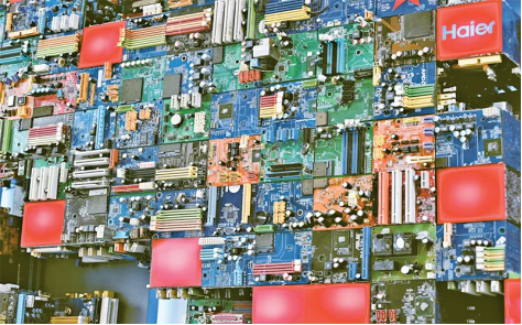 我國實(shí)施全面節(jié)約戰(zhàn)略,大力發(fā)展循環(huán)經(jīng)濟(jì)。圖為2024年9月27日,在海爾綠色再循環(huán)互聯(lián)工廠展廳內(nèi)拍攝的用廢舊電路板制作的裝飾墻。海爾綠色再循環(huán)互聯(lián)工廠每年可拆解廢舊家電200萬臺,再生循環(huán)新材料約3萬噸。新華社記者李紫恒/攝