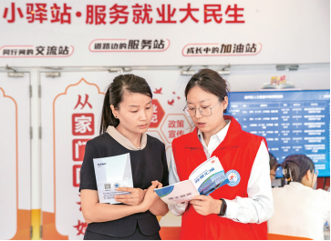 零工市場是向靈活就業(yè)人員與用工主體提供就業(yè)服務(wù)的重要載體。圖為2024年9月3日,江蘇省南通市通州區(qū)萬達(dá)廣場“零工驛站”內(nèi),就業(yè)服務(wù)人員在向求職者介紹就業(yè)創(chuàng)業(yè)政策。人民圖片翟慧勇/攝