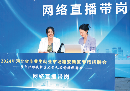 高校畢業(yè)生等青年群體就業(yè)是就業(yè)工作的重中之重,事關(guān)就業(yè)基本盤的穩(wěn)定。2024年9月25日,雄安新區(qū)舉辦2024年河北省畢業(yè)生就業(yè)市場雄安新區(qū)專場招聘會暨河北雄安新區(qū)大型人力資源招聘會。圖為當(dāng)日招聘單位代表在現(xiàn)場進行網(wǎng)絡(luò)直播帶崗。新華社發(fā)落飛麟/攝