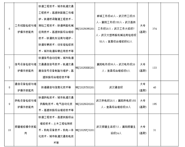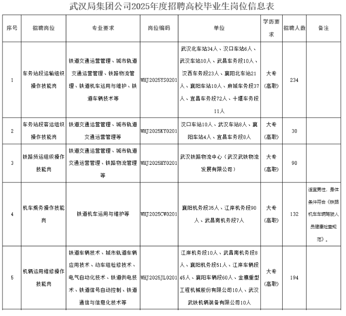 武漢局集團(tuán)公司2025年度招聘高校畢業(yè)生崗位信息表