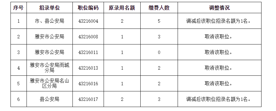 根據(jù)中共雅安市委組織部、雅安市公安局《關(guān)于雅安市2025年度公開考試錄用公務(wù)員(人民警察)的公告》規(guī)定,結(jié)合各職位報(bào)名繳費(fèi)情況,現(xiàn)將未達(dá)到筆試開考比例職位調(diào)整情況公告如下。