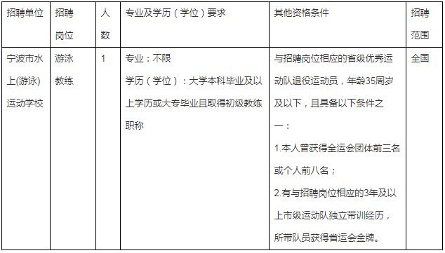 根據(jù)《寧波市事業(yè)單位公開招聘工作人員實(shí)施辦法》的有關(guān)規(guī)定,市體育局直屬單位寧波市水上(游泳)運(yùn)動(dòng)學(xué)校,決定面向社會(huì)公開招聘事業(yè)編制教練員1名。現(xiàn)就有關(guān)事項(xiàng)公告如下: