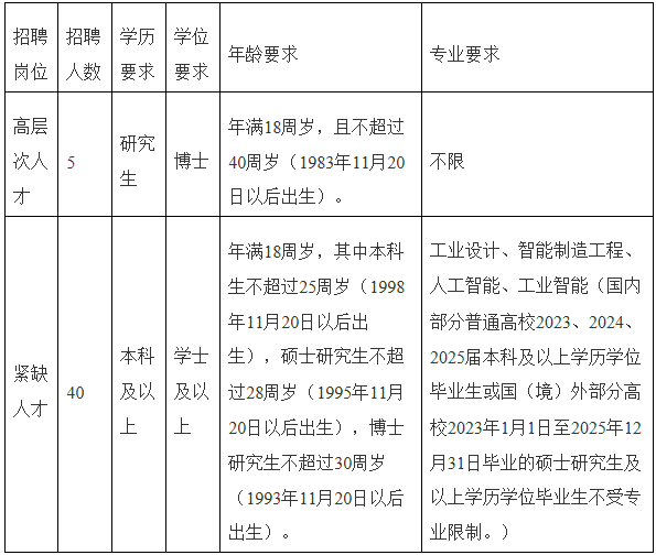1.具有寧波市戶籍或生源,所學工業(yè)設計、智能制造工程、人工智能、工業(yè)智能專業(yè)的國內普通高校2023、2024、2025屆本科及以上學歷學位畢業(yè)生或國(境)外高校2023年1月1日至2025年12月31日畢業(yè)的碩士研究生及以上學歷學位畢業(yè)生。