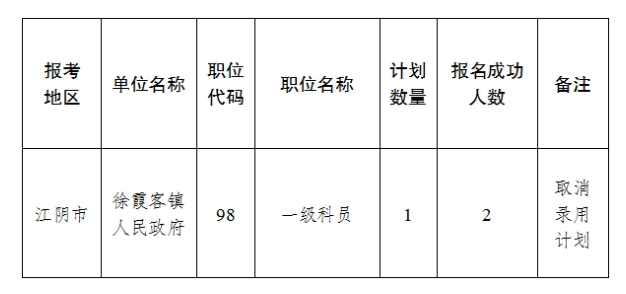 根據(jù)《無錫市2025年度考試錄用公務(wù)員簡章》及相關(guān)規(guī)定,1個職位因有效報名人數(shù)與招錄人數(shù)之比小于開考比例,按規(guī)定取消該職位錄用計劃。