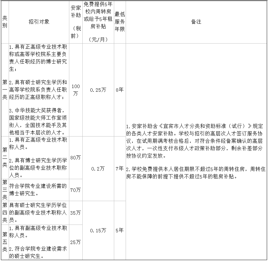 通過本公告引進(jìn)且符合條件經(jīng)備案確認(rèn)的高層次人才,原則上在宜服務(wù)期限不低于5年,除享受單位工資福利外,還可按照《宜賓市人才分類和資助標(biāo)準(zhǔn)(試行)》和宜賓工業(yè)職業(yè)技術(shù)學(xué)院(籌)相關(guān)政策規(guī)定享受引進(jìn)人才相關(guān)政策待遇: