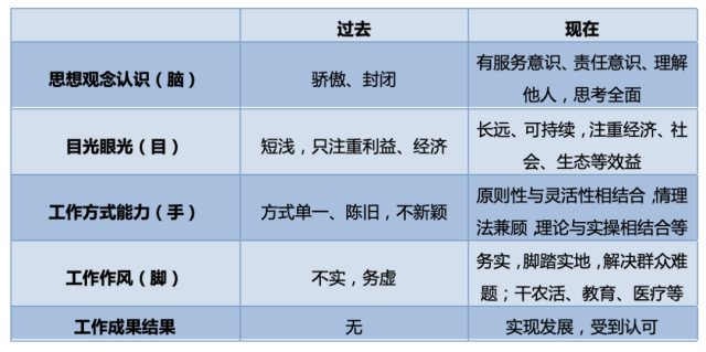 1.思想觀念認(rèn)識上,從自視甚高到理解農(nóng)民,融通群眾;從固執(zhí)己見到聽取領(lǐng)導(dǎo)意見,服務(wù)人民。