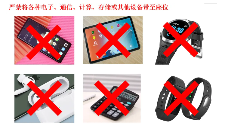 2.考生入座前,需按照要求將規(guī)定可攜帶文具以外的物品放在指定位置。手機(jī)等通訊工具應(yīng)關(guān)閉鬧鐘,并關(guān)機(jī)。嚴(yán)禁將手機(jī)、智能手表、智能手環(huán)、藍(lán)牙耳機(jī)等各種具有發(fā)送或者接收信息功能的通訊工具和具有計(jì)算、存儲(chǔ)功能的電子設(shè)備帶至座位。否則,無論是否使用均視為違紀(jì)??忌梢宰詡淦胀ǖ臋C(jī)械手表掌握時(shí)間。