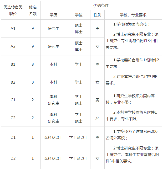 優(yōu)選范圍為國內(nèi)高校中取得全日制研究生學(xué)歷、博士學(xué)位(以下簡稱博士),取得全日制研究生學(xué)歷、碩士學(xué)位(以下簡稱碩士);取得147所“雙一流”建設(shè)高校(見附件1)全日制本科學(xué)歷、學(xué)士學(xué)位(以下簡稱本科生)的人員;山東省屬“高水平大學(xué)”建設(shè)高校及省屬駐棗高校(見附件2)畢業(yè)的符合條件的全日制4年及以上學(xué)制大學(xué)本科生;全球排名前200名高校畢業(yè)的博士、碩士和本科生。根據(jù)教育部辦公廳等五部門《關(guān)于進(jìn)一步做好非全日制研究生就業(yè)工作的通知》(教研廳函〔2019〕1號)規(guī)定,自2017年起,由國家統(tǒng)一下達(dá)招生計(jì)劃、考試招生執(zhí)行相同政策和標(biāo)準(zhǔn)的非全日制研究生可報(bào)考符合條件的相應(yīng)崗位。