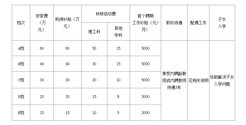 配偶工作安排說明:根據(jù)博士要求和配偶的具體情況,幫助解決配偶工作,博士配偶年齡男需在45歲以下、女需在40歲以下。博士配偶需為普通高等院校畢業(yè)的本科畢業(yè)生(要求取得本科學(xué)歷、學(xué)士學(xué)位),符合地方政府人事代理政策者,按人事代理人員安排;博士配偶符合公開招聘條件的,可按當(dāng)年公開招聘政策和程序參加公開招聘。符合C檔以上條件引進(jìn)的博士,配偶需為全日制本科學(xué)歷。按D檔、E檔條件引進(jìn)的博士,配偶需為普通高等院校畢業(yè)的碩士畢業(yè)生(要求取得研究生學(xué)歷、碩士學(xué)位)方可按人事代理人員安排。高層次人才由于個人原因離開學(xué)校,其經(jīng)學(xué)校內(nèi)部安排工作的配偶須同時離開學(xué)校;在特殊待遇期內(nèi)離婚者,學(xué)校將解除經(jīng)學(xué)校安排工作的配偶的工作關(guān)系。