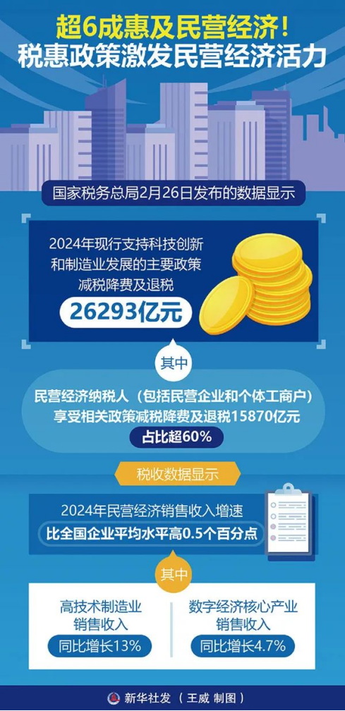 黨的十八大以來,各地區(qū)各部門從減稅降費、市場準入、融資支持等方面出臺系列政策舉措,有力促進民營經(jīng)濟發(fā)展壯大。根據(jù)國家稅務(wù)總局2025年2月26日發(fā)布的數(shù)據(jù),2024年現(xiàn)行支持科技創(chuàng)新和制造業(yè)發(fā)展的稅惠政策超六成惠及民營經(jīng)濟。新華社發(fā) 王威/制圖